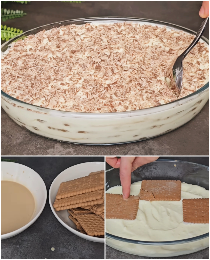 Pregătim un amestec din lapte și cafea instant. Trecem rapid biscuiții prin acest lichid și așezăm un prim strat într-un vas. Adăugăm un strat generos de cremă, apoi repetăm alternând biscuiți și cremă până terminăm ingredientele, ultimul strat fiind de cremă.