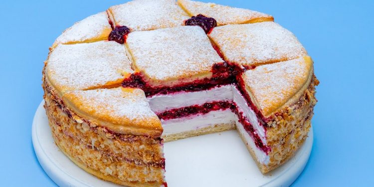 Decorăm cu bucățile coapte de foietaj și presărăm zahăr pudră. Decorăm marginile cu surplusul de foietaj (zdrobit).